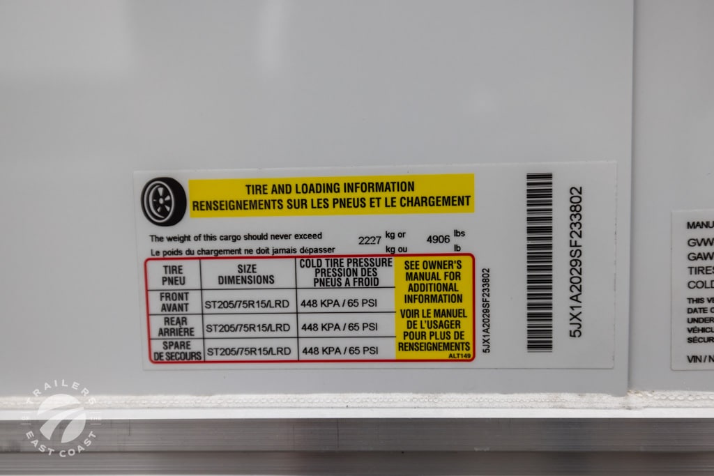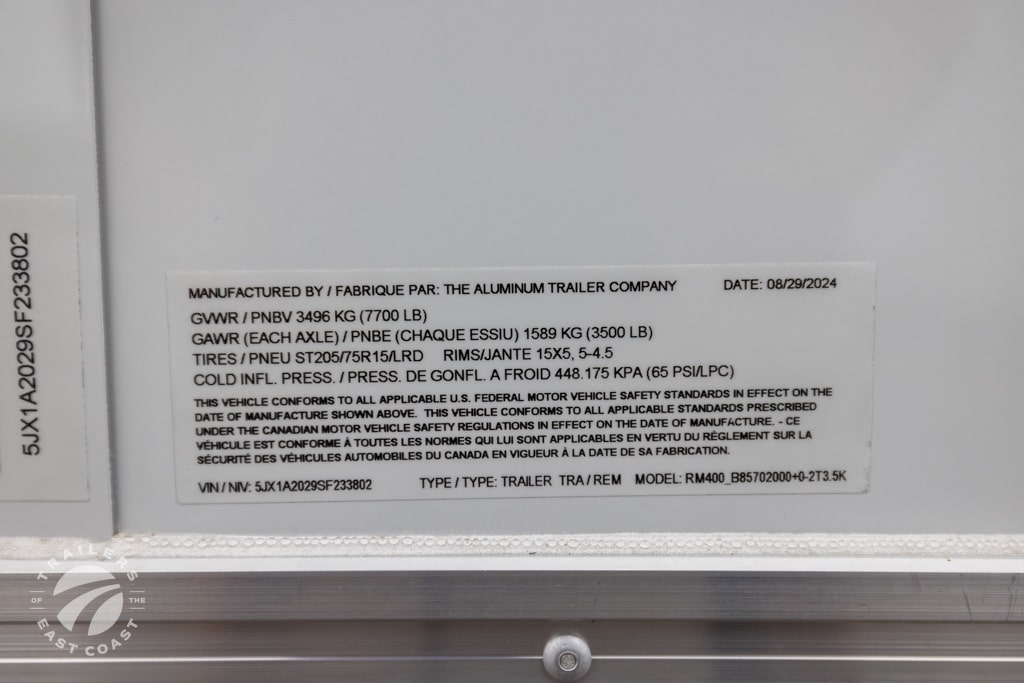 Axle Type: Torsion Axle Quantity: 2 Axle Weight Capacity: 3,500 lbs. Escape Door: Yes Exterior Color: Polar White Exterior Height: Exterior Width: Frame Type: Aluminum GVWR: 7,700 lbs. Hitch Ball Size: 2-5/16" Interior: Unfinished Interior Height: 84" Interior Width: 97" Lift Capacity: Overall Length: 25'6" Payload Capacity: 4,906 lbs. Ramp Capacity: 4,000 lbs. Rear Opening Height: 83" Rear Opening Width: 90" Tire Age: Tire Size: ST205/75R15 LRD Trailer Weight: 2,794 lbs. |