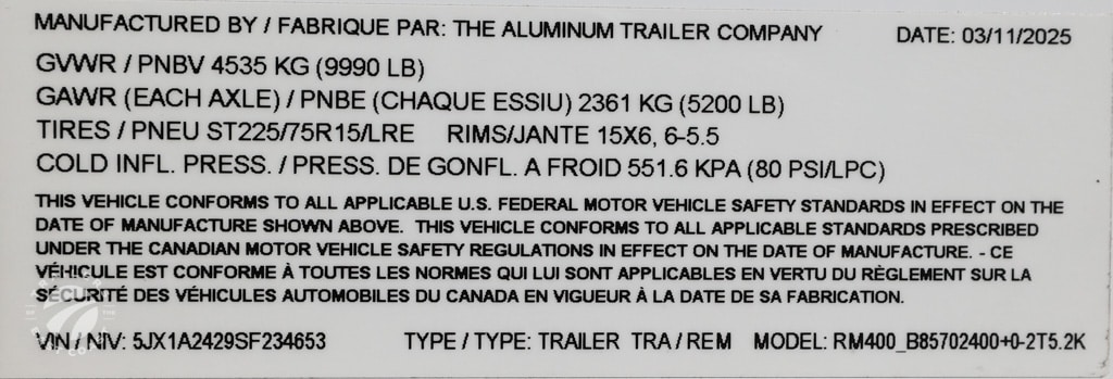 Axle Type: Torsion Axle Quantity: 2 Axle Weight Capacity: 5,200 lbs. Escape Door: No Exterior Color: Polar White Exterior Height: Exterior Width: Frame Type: Aluminum GVWR: 9,990 lbs. Hitch Ball Size: 2-5/16" Interior: Unfinished Interior Height: 84" Interior Width: 97" Lift Capacity: Overall Length: 29'6" Payload Capacity: Ramp Capacity: Rear Opening Height: 83" Rear Opening Width: 90" Tire Age: Tire Size: ST225/75R15 LRE Trailer Weight: 3,142 lbs. |