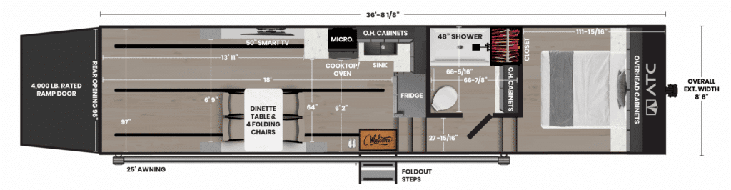 Awnings: 2 Axle Type: Torsion Axle Quantity: 2 Axle Weight Capacity: 7,000 lbs. Black Capacity: 45 Gallons Exterior Color: White/Black/Silver/Pewter/Med. Charcoal Exterior Height: Exterior Width: Floorplan: Frame Type: Aluminum Fresh Capacity: (2) 100 Gallons Front Bedroom: No Fuel Capacity: Generator: Yes Gray Capacity: 90 Gallons GVWR: 16,800 lbs. Interior Color: Interior Height: 8' to 10' (6'2" Bunk) Interior Width: Overall Length: 37'3" Payload Capacity: 4,800 lbs. Ramp Capacity: Ramp Patio: No Rear Opening Height: 90" Rear Opening Width: 96" Ramp Patio: No Sleeping Capacity: Solar Panels: No Tire Age: Tire Size: Trailer Weight: 12,000 lbs. |