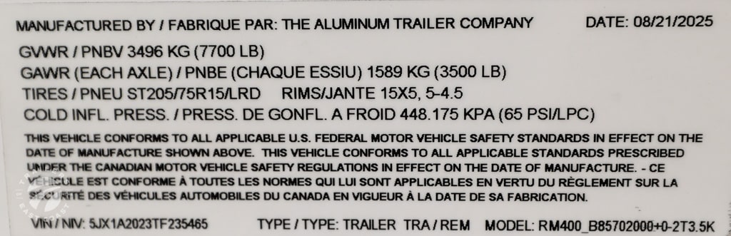 Axle Type: Torsion Axle Quantity: 2 Axle Weight Capacity: 3,500 lbs. Escape Door: No Exterior Color: Polar White Exterior Height: Exterior Width: Frame Type: Aluminum GVWR: 7,700 lbs. Hitch Ball Size: 2-5/16" Interior: Unfinished Interior Height: 84" Interior Width: 97" Lift Capacity: Overall Length: 25'6" Payload Capacity: 5,015 lbs. Ramp Capacity: 4,000 lbs. Rear Opening Height: 83" Rear Opening Width: 90" Tire Age: Tire Size: ST205/75R15 LRD Trailer Weight: 2,685 lbs. |