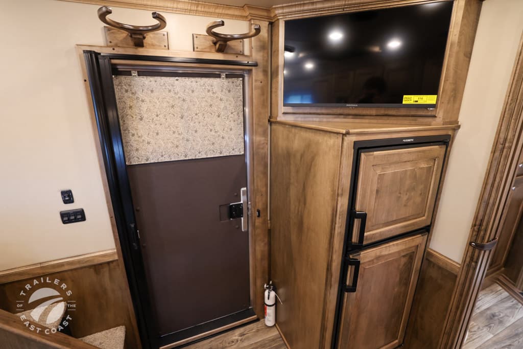 Rear tack, stud divider, mangers, escape door & bridle hooks for organized horse care