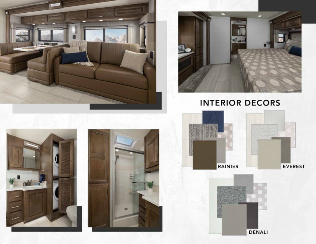 Awnings: Axle Quantity: Black Capacity: 75 Gallons Chassis: Freightliner Cascadia 116 Single Axle Engine: Detroit DD13 Exterior Color: 7 Available Paint Options Exterior Height: Floorplan: 38EMB/40ERB Fresh Capacity: 150 Gallons Fuel Capacity: 120 Gallons Fuel Type: Diesel Gray Capacity: 75 Gallons Generator Size: 8kW Onan Quiet Diesel GVWR: 41,000 lbs. Horsepower: 525 HP Interior Color: Interior Height: 7' Interior Width: Motorhome Class: Class C Off-Grid Capable: Yes Onboard Carrying Capacity Overall Length: 38'6" (38EMB) 40'5" (40ERB) Sleeping Capacity: Slideouts: 4 Solar Panels: No Tire Age: Tire Size: Torque: 1,850 lb./ft. Towing Capacity: 20,000 lbs. Transmission: Allison TRV4000 Electronic 6-Speed |