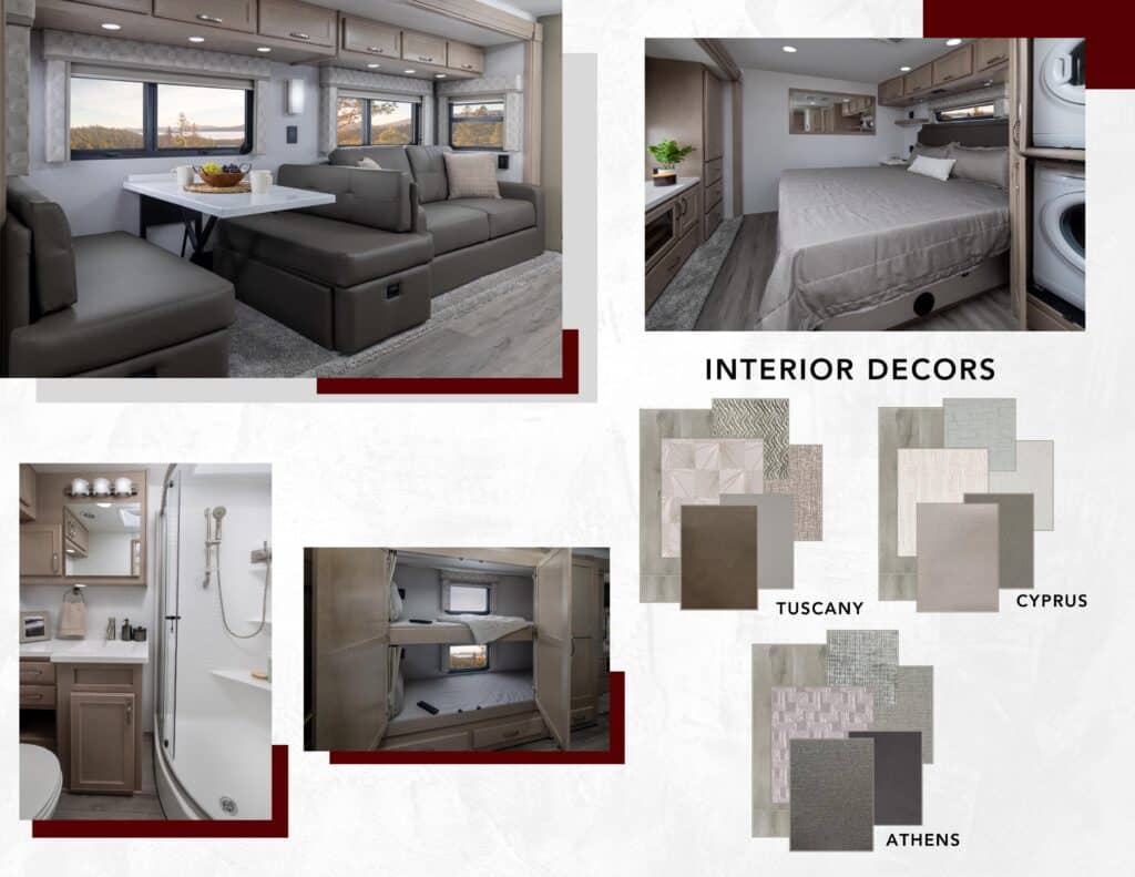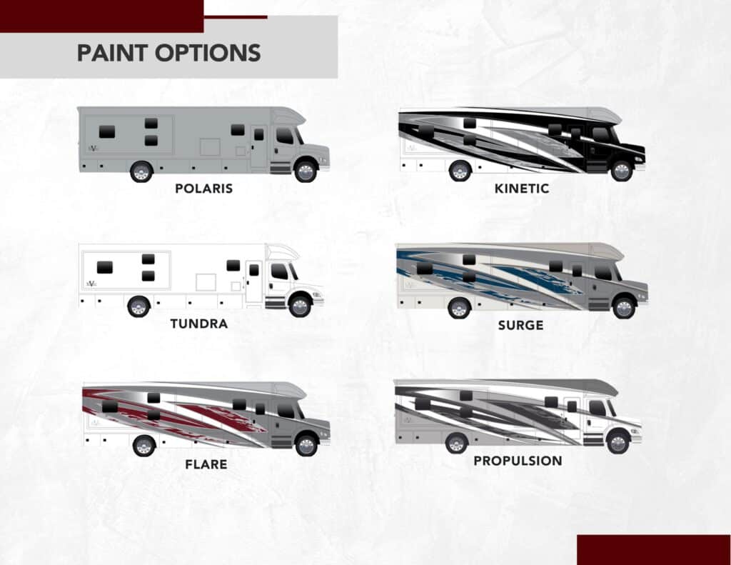 Awnings: Axle Quantity: Black Capacity: 75 Gallons Chassis: Freightliner M2-106 Engine: Cummins L9 Exterior Color: 6 Paint Options Available Exterior Height: Floorplan: 36VSB / 40VBH / 40VRB Fresh Capacity: 150 Gallons Fuel Capacity: 100 Gallons Fuel Type: Diesel Gray Capacity: 75 Gallons Generator Size: 8kW Onan Quiet Diesel GVWR: 34,300 lbs. Horsepower: 360 HP Interior Color: Interior Height: 7' Interior Width: Motorhome Class: Class C Off-Grid Capable: Yes Onboard Carrying Capacity Overall Length: 36'8" (36VSB) 39'10" (40VRB/40VBH) Sleeping Capacity: Slideouts: 2 Solar Panels: No Tire Age: Tire Size: Torque: 1,150 lb./ft. Towing Capacity: 20,000 lbs. Transmission: Allison 3200TRV Electronic 6-Speed |