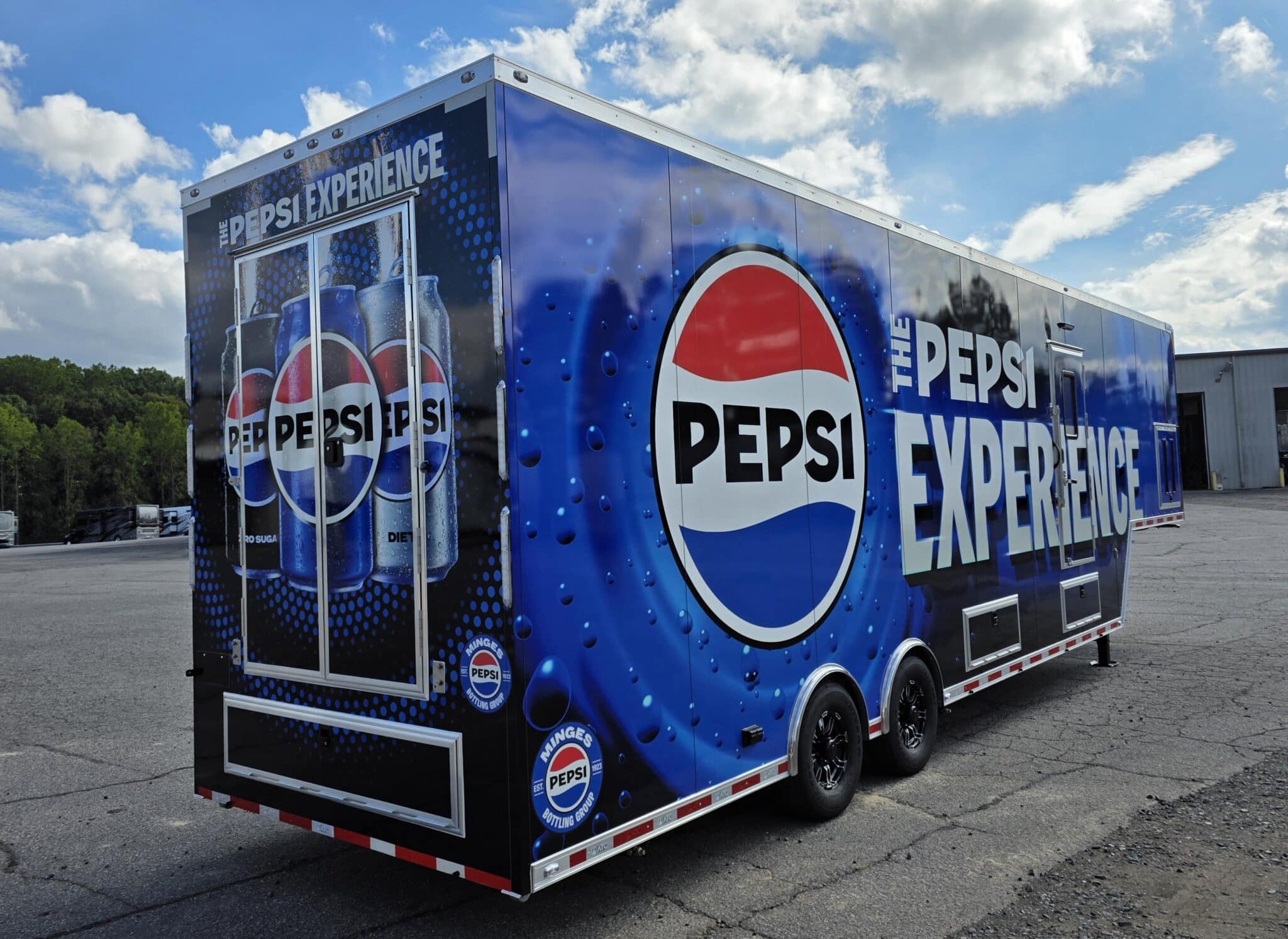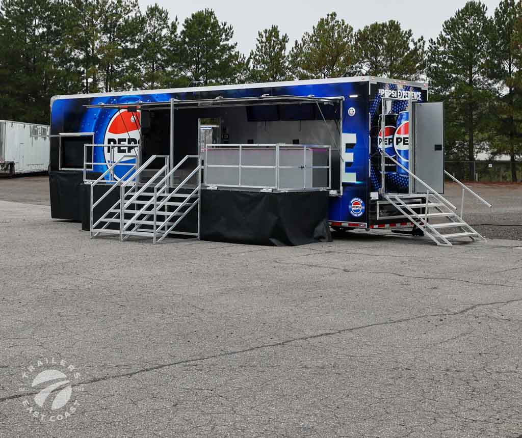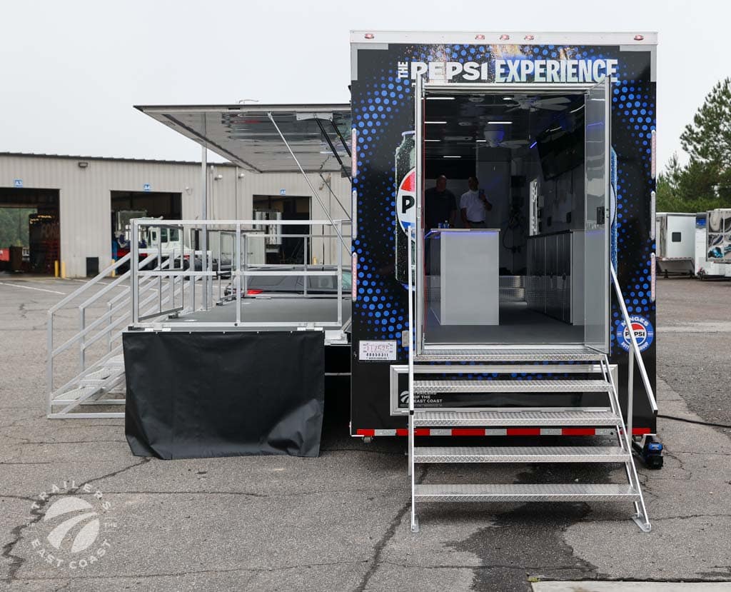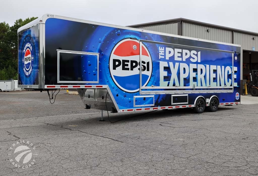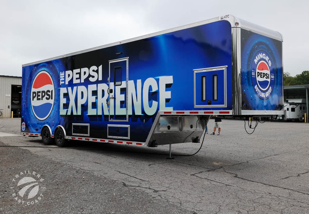 We worked with Minges Bottling Group/Pepsi to design this custom 8.5’ X 38’ ATC PRO 300S Stage/Display Trailer. It will serve as a mobile showroom for Pepsi product samplings at events across North Carolina.