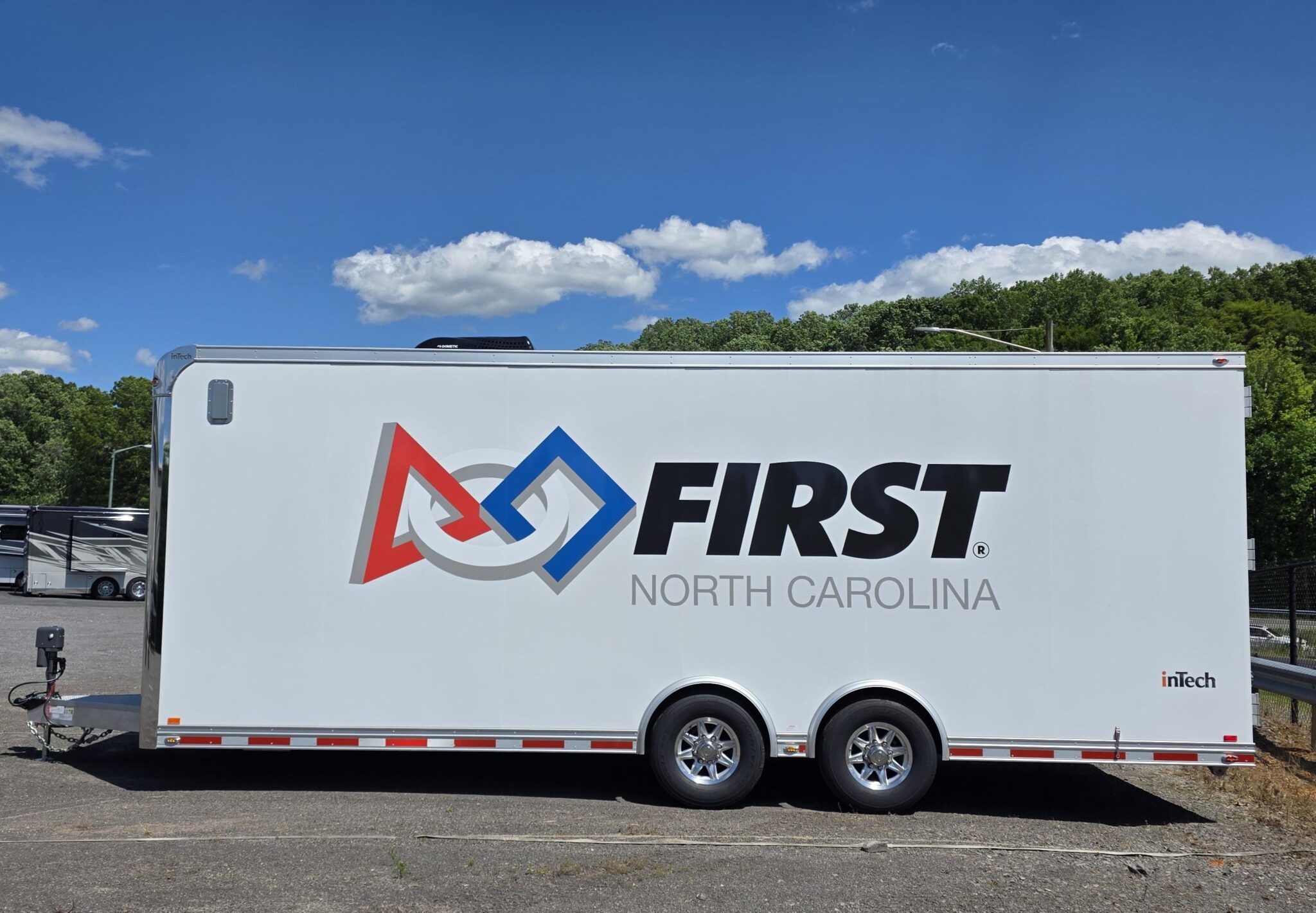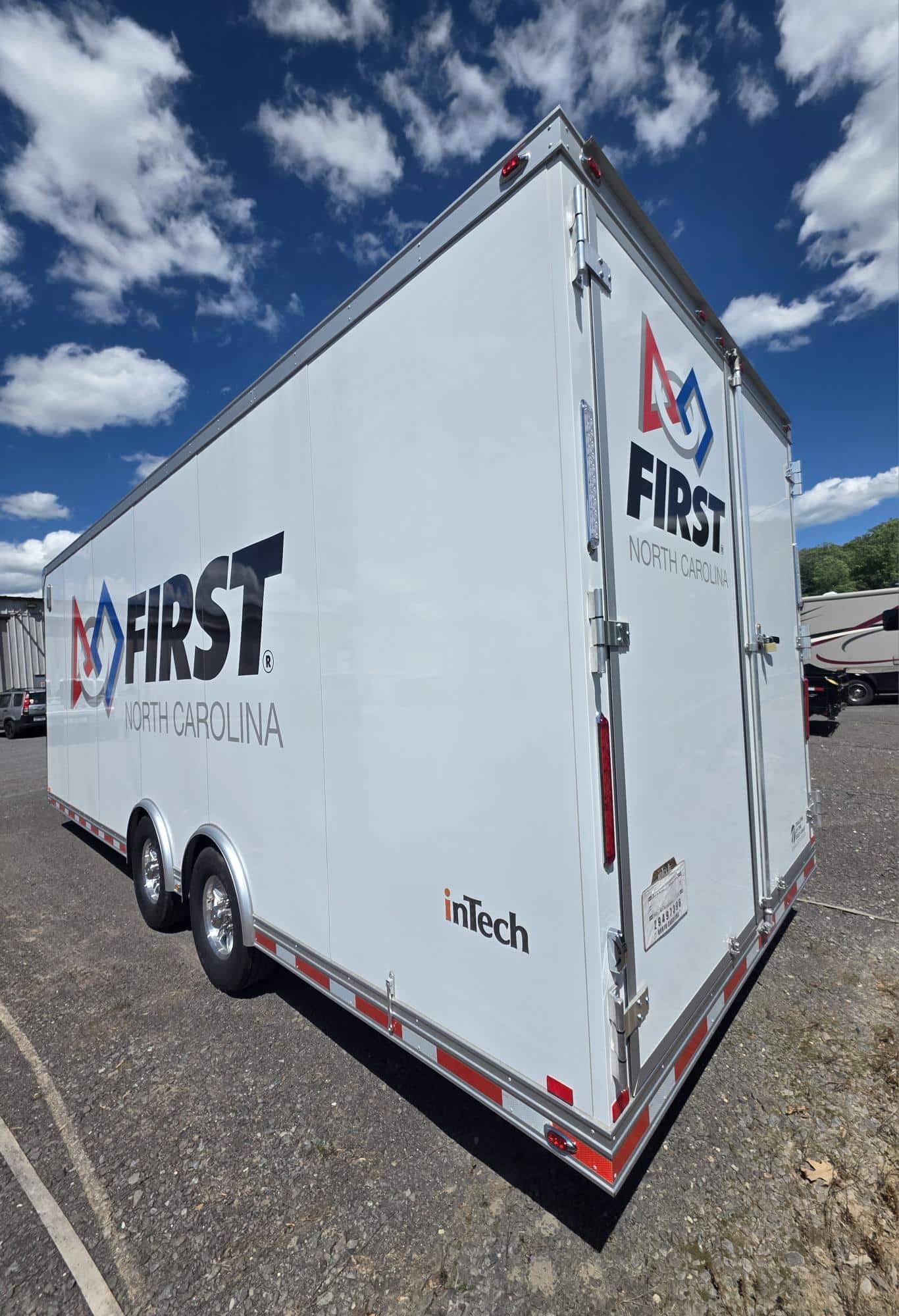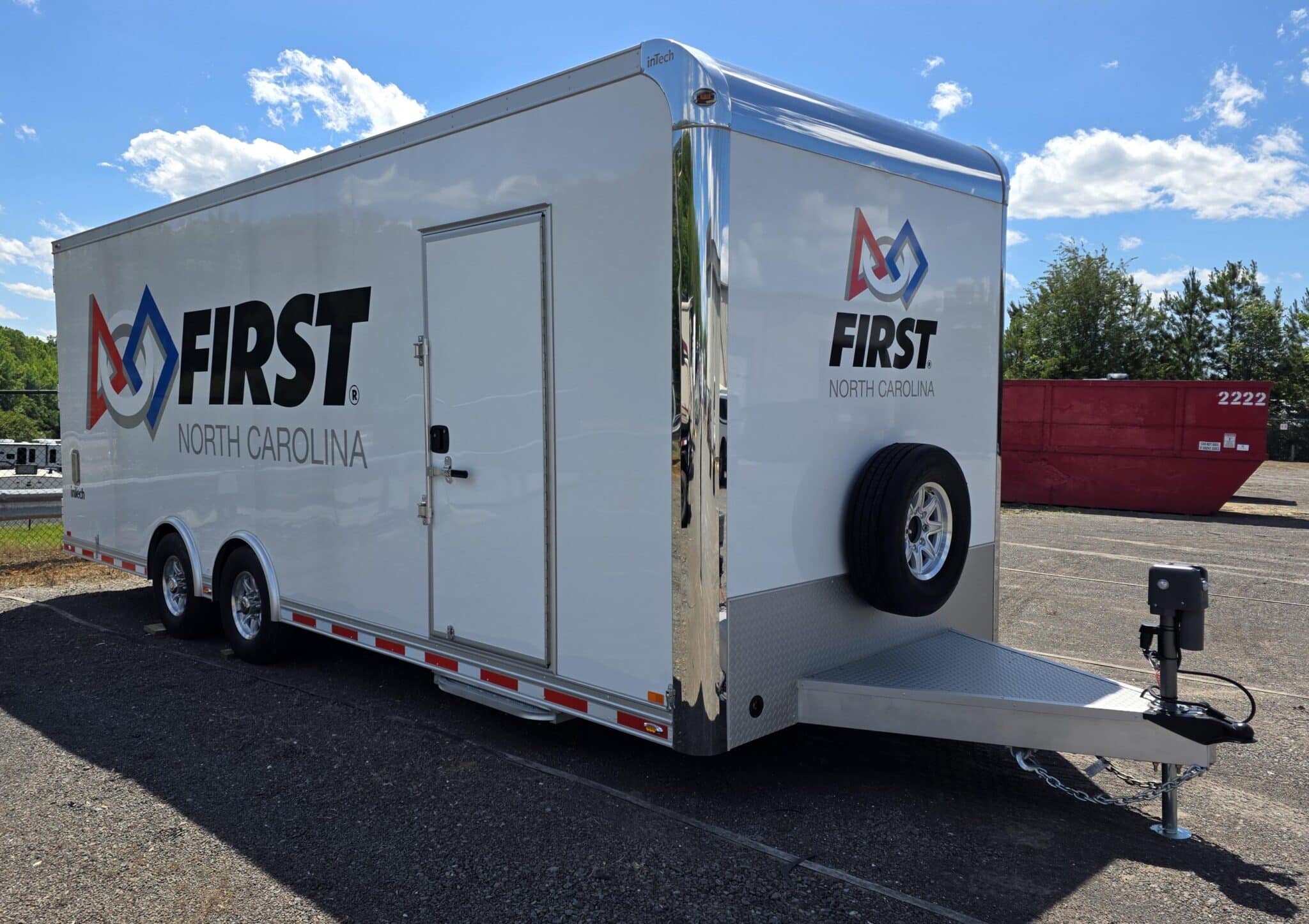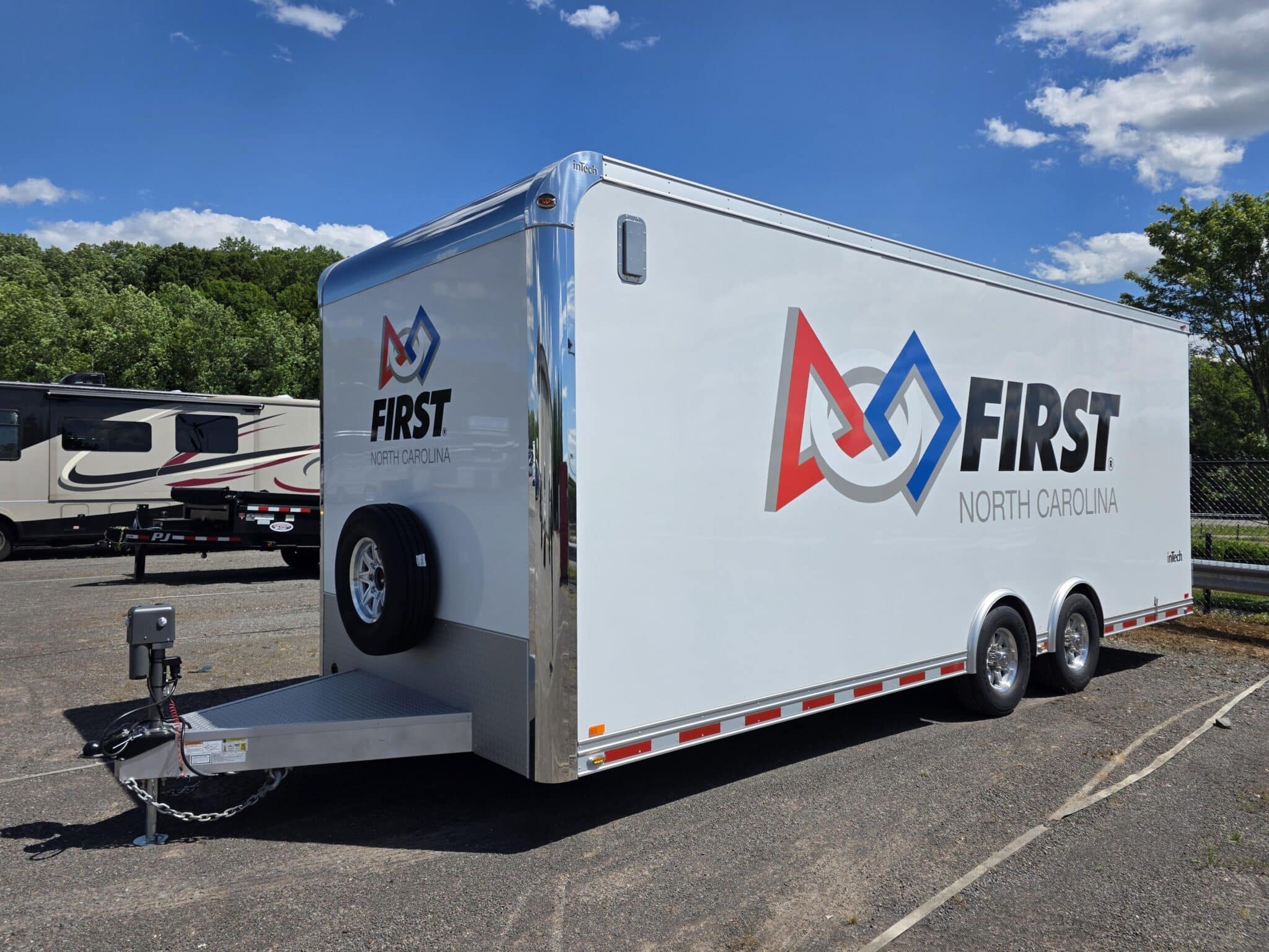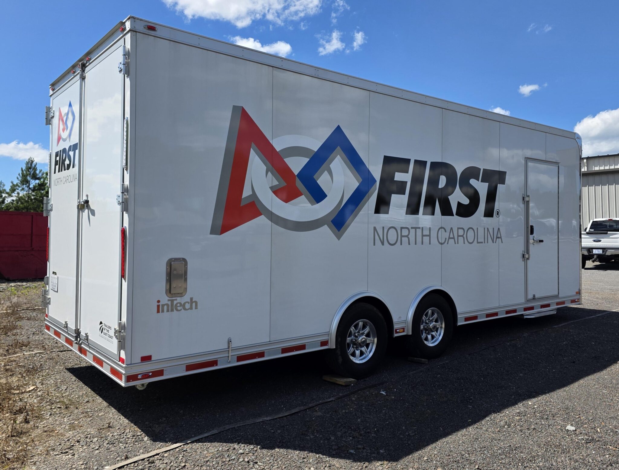 We worked with First NC to design this custom 8.5'x24' inTech Advanced Manufacturing Training Lab trailer to serve as a mobile lab for continuing technical education in robotics. They also use the trailer to host robotics competitions and display heavy duty machinery made to work with robotics.