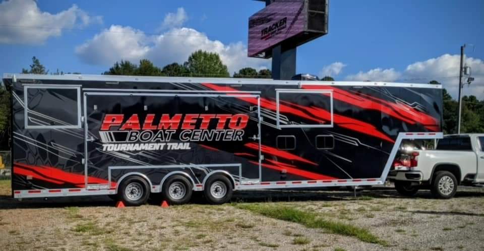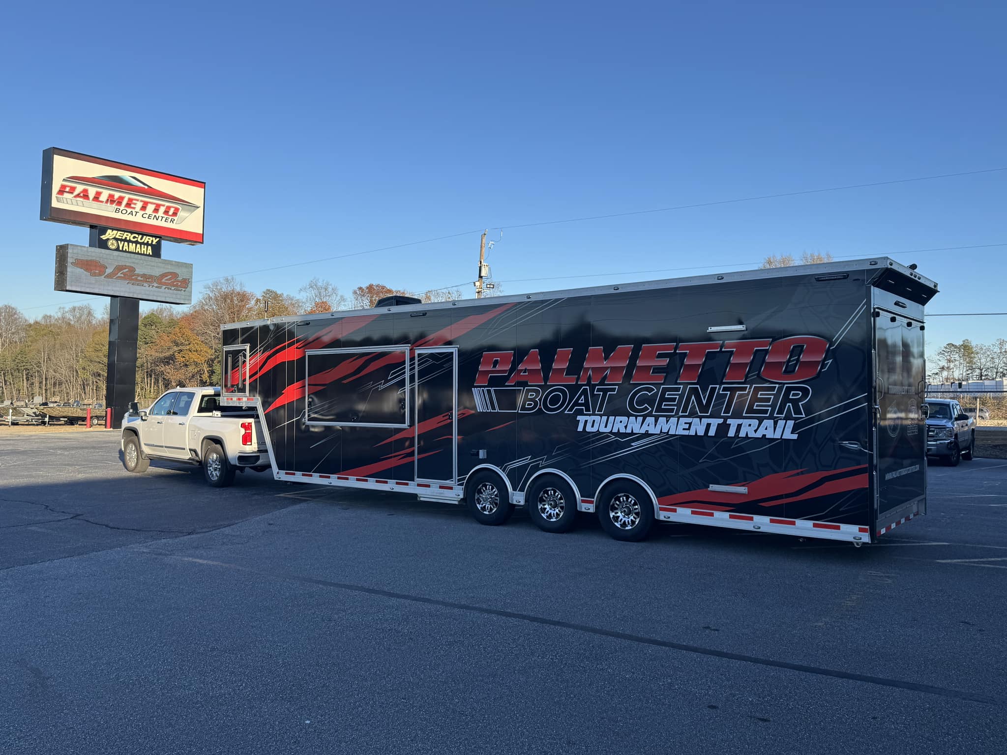 We worked with Palmetto Boat Center to design this 8.5' x 41' ATC Pro 300S Stage Trailer to assist them in running their fishing tournaments and promoting their dealership at events.